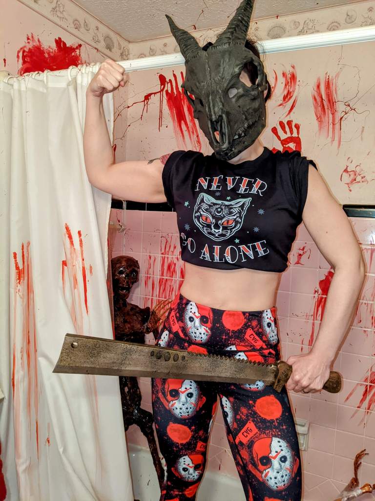 If you’ve made it this far, here’s a bonus of my goofy ass posing for a Friday-the-13th-themed flex photo competition hosted by a fitness group I belong to on Facebook. I didn’t win anything, but I think my theming was pretty on-point. And if you tilt your head and squint, you can see the little bit of muscle I’ve been carefully cultivating the past year plus.