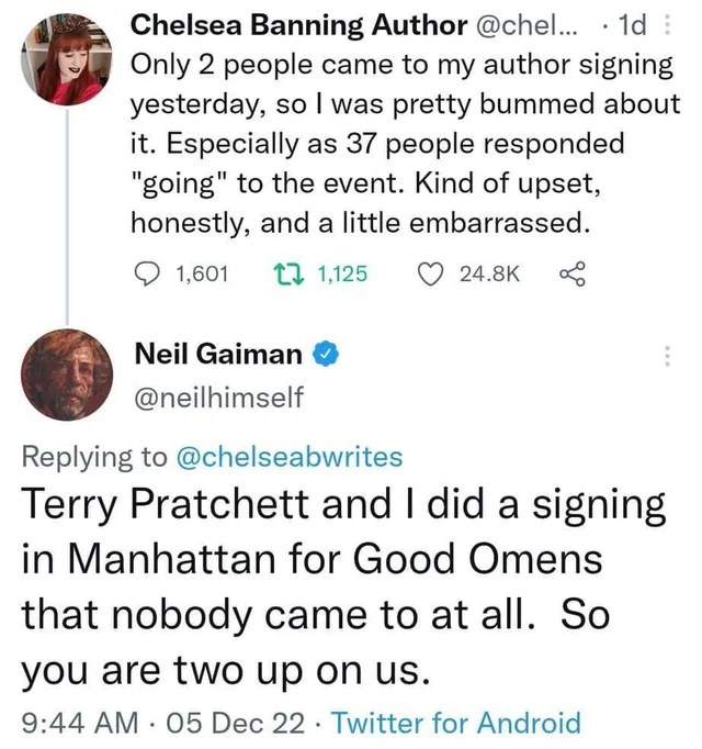 I usually do at least a couple of events every year, but they’re almost always conventions or local indie author events where I’m part of a larger group. Doing a solo event is both exciting and nerve-wracking, as there’s always the fear that no one will show up. I’m trying to keep this anecdote from Neil Gaiman in mind for comfort:
